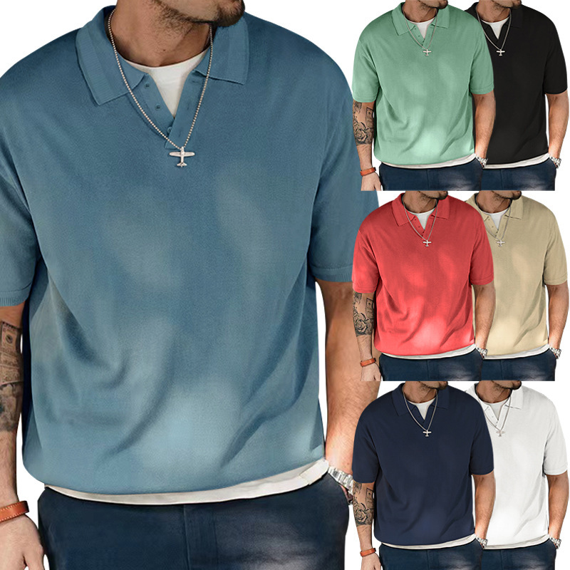 Marškiniai su aukštu atvartu, plačiomis trumpomis rankovėmis, vienspalviai, laisvalaikio vyriški trumpomis rankovėmis V kaklo